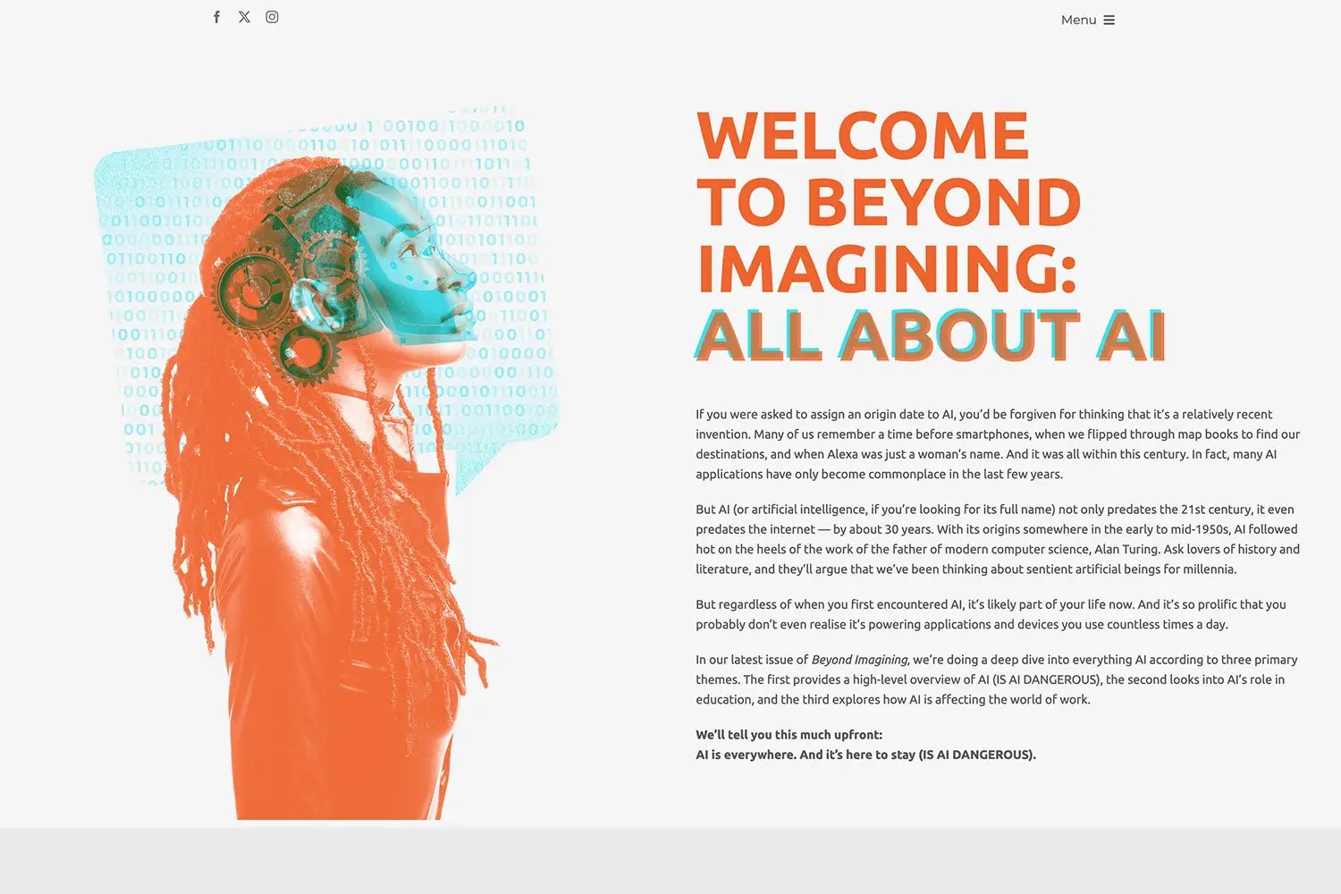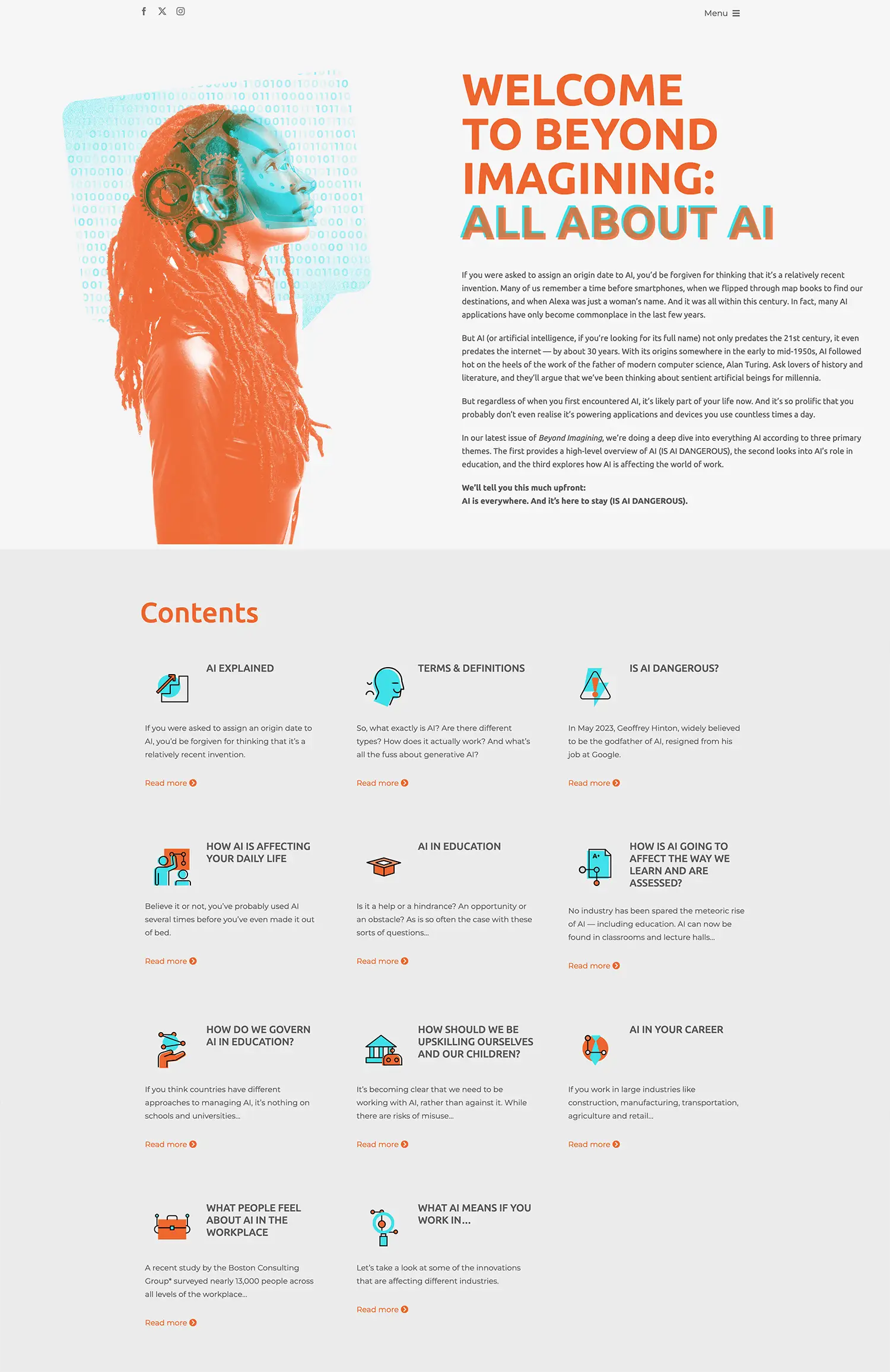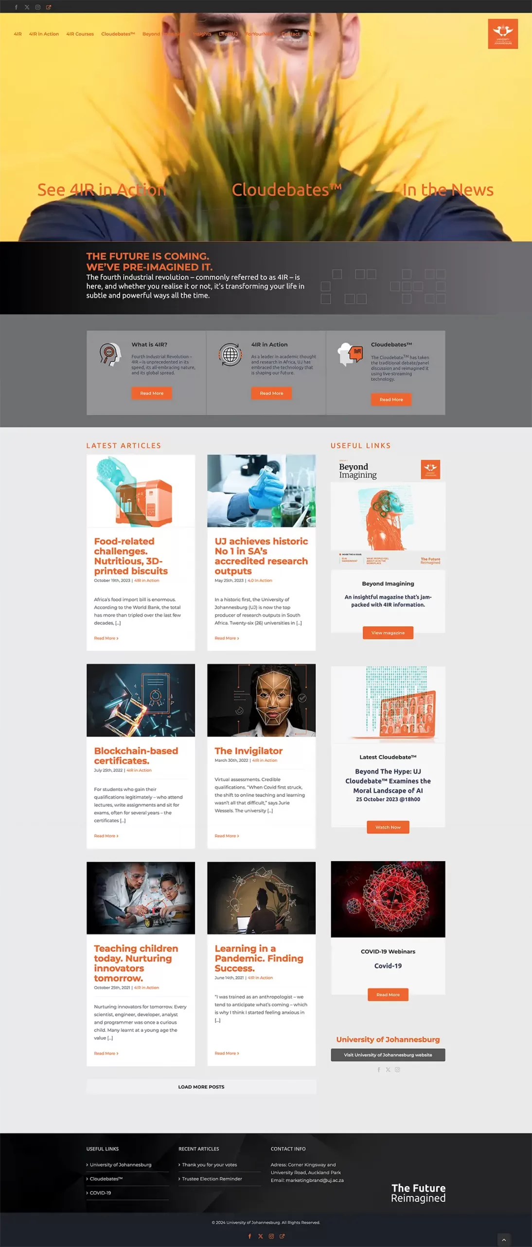 University of Johannesburg’s special site to discuss all things Fourth Industrial Revolution (4IR). The original design look-and-feel were created by HKLM. The interpretation of both the website and online versions of the 4IR magazine Beyond Imagining, which is not just a pdf of a magazine you flip though, but one that brings an interactive experience to the reader, was created by me.